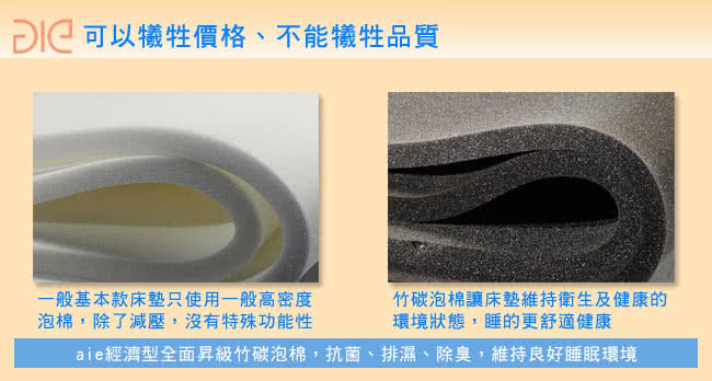 ?.aie 享愛名床 經濟型彈簧床墊(真四線竹碳+3M防潑水+記憶膠)為最基本款的彈簧床墊之一,但用料的選擇上卻一點都不基本,不論是彈簧、內部襯材、表布到製作工藝,都要比一般基本款的床墊還要好,本款表布經3M防潑水處理,防止水氣滲透造成內部潮濕,表面好清理,但不減其透氣性,另外內材加上釋壓記憶膠層,超低的反射壓,不壓迫表皮肌膚及血管,讓躺臥更舒適無壓力,搭配原有的竹碳泡棉,讓睡眠環境更衛生,而且誠實告知您產品的等級,不會低價品、高價賣,讓您花的錢更有價值也更能為您帶來健康的睡眠。(此款為真四線做工,除了增加內部襯材外,亦隔離內材層和彈簧層,更耐用也更衛生)